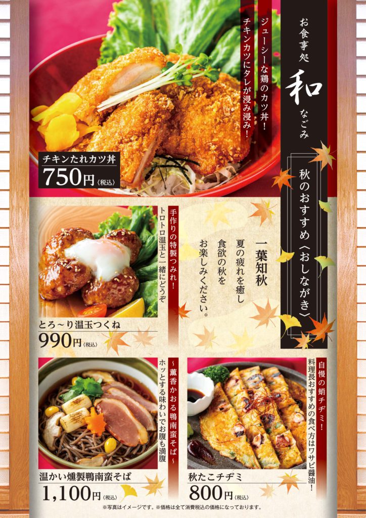 お食事処 なごみ 期間限定のおすすめメニューのお知らせ 2025.09.28 和 なごみ 10月からの秋の新メニューのお知らせです。 〇大きなチキンカツに和風たれで食欲をそそる チキンたれカツ丼 〇手作りの味 とろ~り温玉つくね 〇あったかメニュー 温かい燻製鴨南蛮そば 〇韓国粉もん 秋たこチヂミ ご家族で またお仲間とグラスを傾けながら秋の夜のお食事をお楽しみください!!